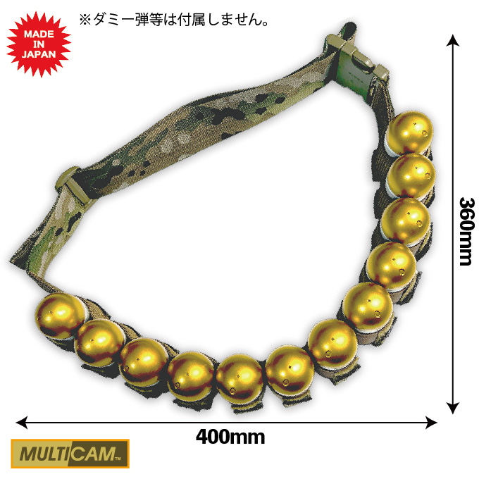 ベルトに縦向きに直径40mmグレネードロケット弾12発収納可能です。